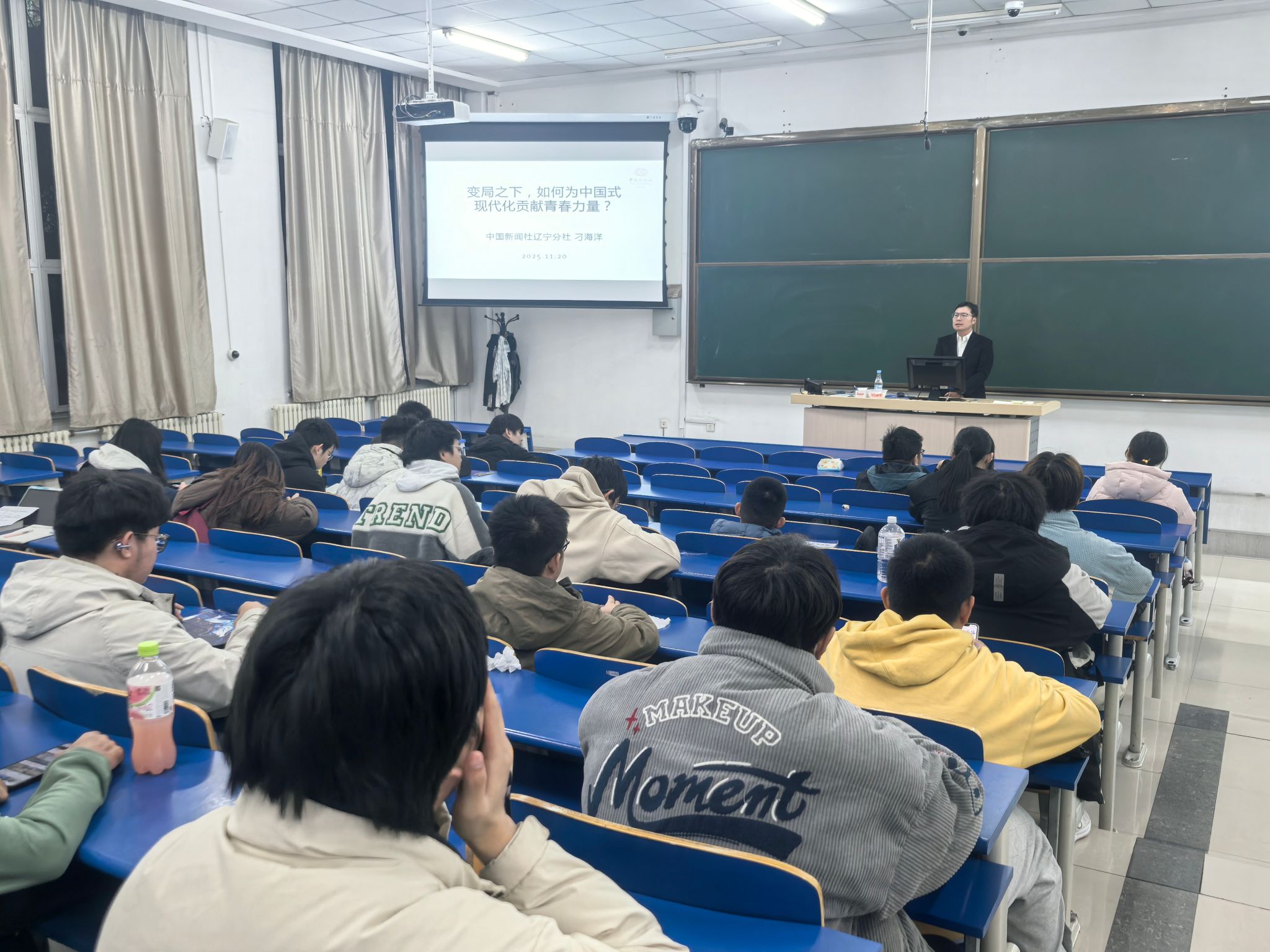 11月20日晚,东北大学“大视野”素质提升讲座在大成教学馆101室举行,中国新闻社辽宁分社社长刁海洋以“变局之下,如何为中国式现代化贡献青春力量”为题作专题讲座。