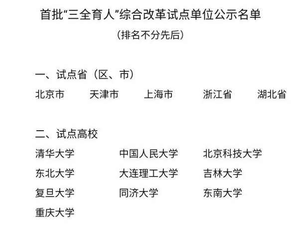 近日,教育部办公厅正式发布《教育部办公厅关于公布首批“三全育人”综合改革试点单位名单的通知》,经报送单位推荐、专家审议、结果公示,遴选产生5个“三全育人”综合改革试点区、10个“三全育人”综合改革试点高校、50个“三全育人”综合改革试点院(系),东北大学入选首批“三全育人”综合改革试点高校。