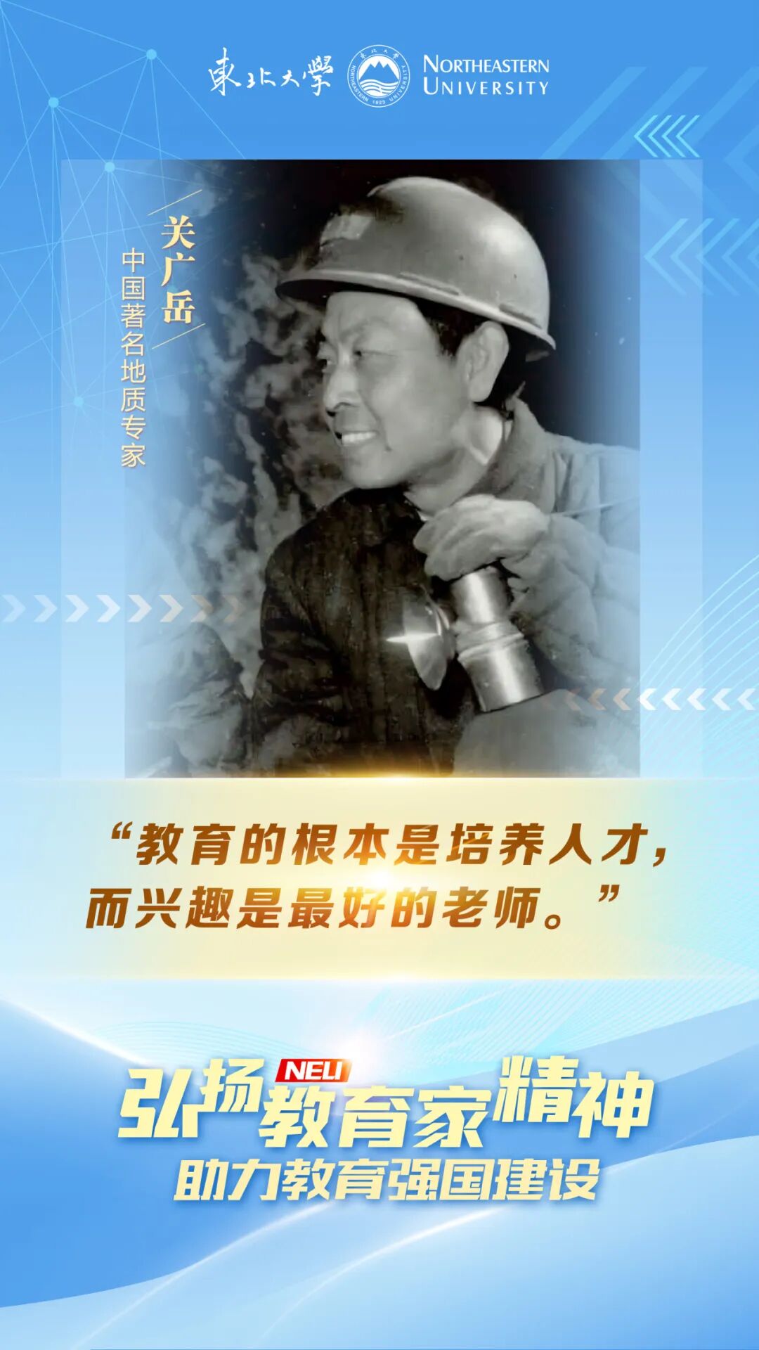 地质锤敲开岩层的回响,穿越62载光阴依旧清晰;罗盘指针定格的方向,始终朝着育人与报国的远方。在东北大学的校园里,在神州大地的矿脉间,矿床地球化学学科的重要开拓者、东北地质教育拓荒人关广岳,用一生践行“山河即课堂”的信念,将教育家精神深植大地,在科研与育人的征程上,书写了一曲质朴而壮丽的育人华章。
