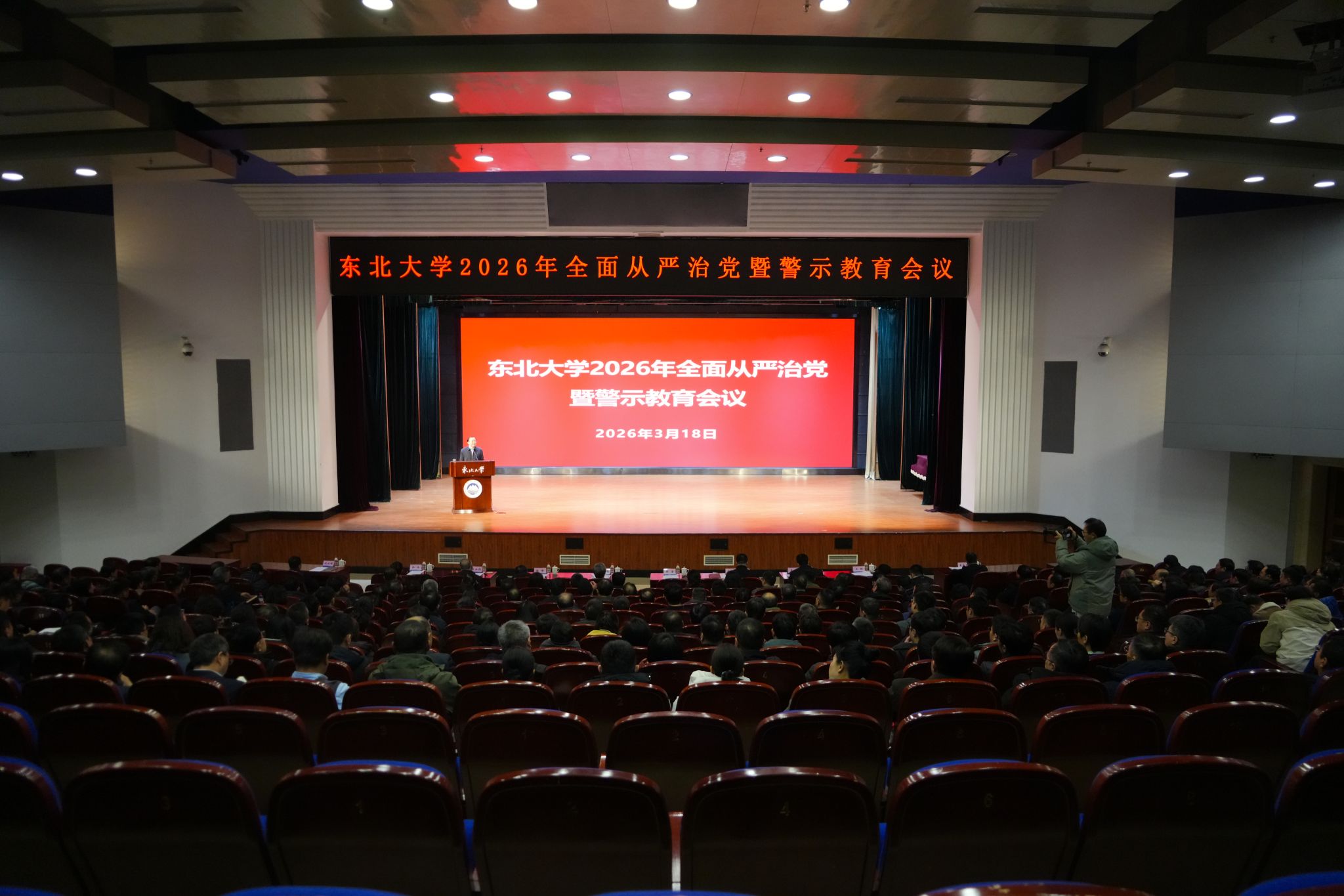 3月18日上午,东北大学召开2026年全面从严治党暨警示教育会议,深入学习贯彻习近平总书记在二十届中央纪委五次全会上的重要讲话和全会精神,认真落实教育系统全面从严治党工作视频会议要求,总结2025年东北大学全面从严治党工作,通报违纪违法典型案例,部署2026年重点任务。校党委书记郭海出席会议并作部署讲话,校长冯夏庭主持会议并传达有关会议精神,校党委副书记、纪委书记吴豪伟总结部署学校纪委工作。