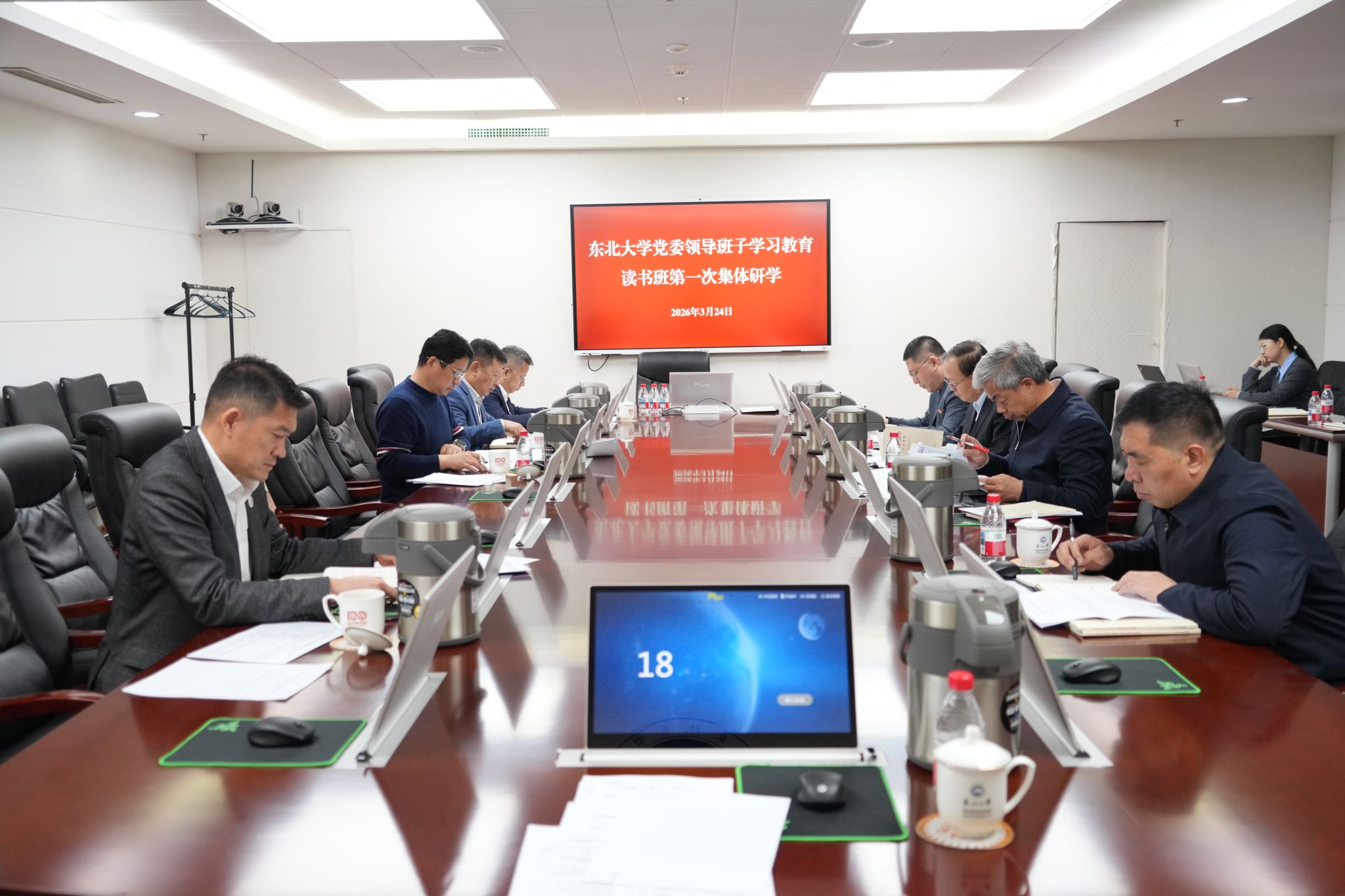 3月24日,东北大学党委领导班子在主楼1415室开展树立和践行正确政绩观学习教育读书班第一次集体研学。校党委书记郭海主持学习,传达学习习近平总书记在参加十四届全国人大四次会议江苏代表团审议时的重要讲话精神、中央党的建设工作领导小组有关文件精神、教育部党组树立和践行正确政绩观学习教育读书班精神,并对开好读书班进行动员部署。学校党委常委、学习教育工作专班主要成员参加学习。