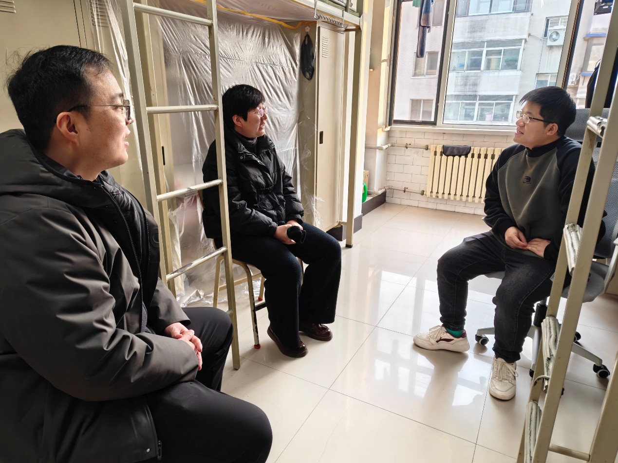 李晓璐详细了解学生寒假期间学习安排、生活需求及科研进展,充分肯定了学生潜心科研的学术追求,叮嘱学生要劳逸结合,常与家人、导师保持联系,遇到问题及时与辅导员沟通。马犇细致询问学生各方面需求,叮嘱学生留校期间的安全注意事项,筑牢安全防范的思想防线。