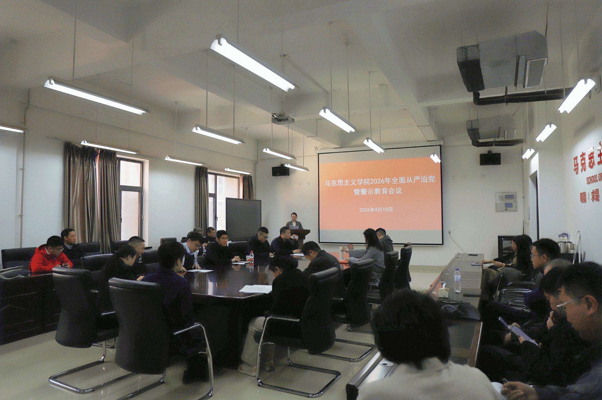 4月15日,马克思主义学院在浑南校区文管学馆A217室召开2026年全面从严治党暨警示教育会议。学院领导班子成员及全体党员干部参加会议,党委副书记、副院长(兼)王寰主持会议。