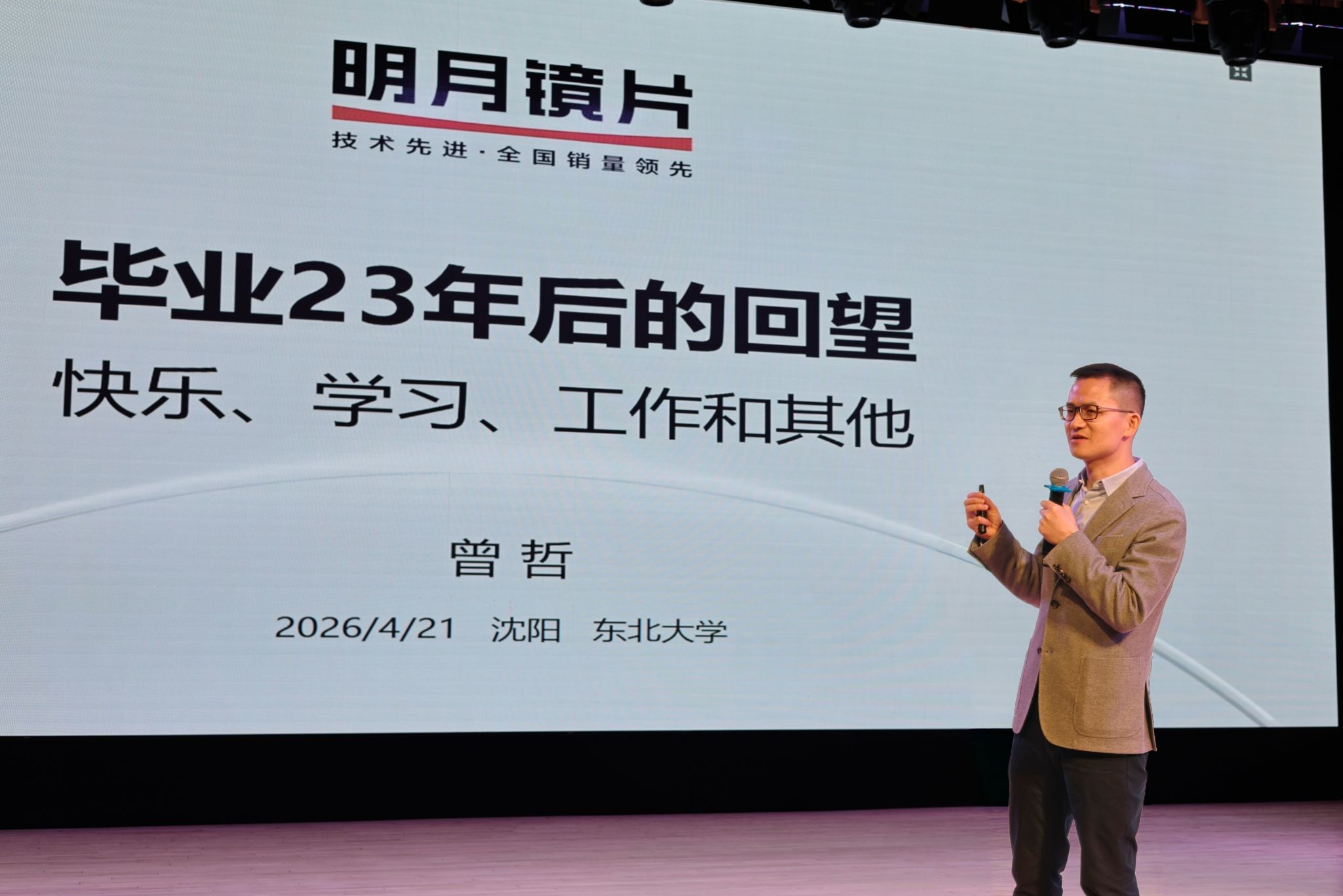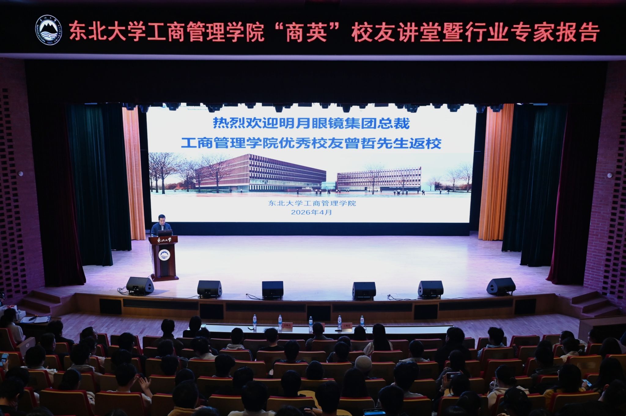 4月21日,工商管理学院“商英”校友讲堂暨行业专家报告会在浑南校区图书馆泰山学术报告厅举行。本期讲堂特邀明月眼镜集团总裁、永久合伙人,工商管理学院2003届国际经济与贸易专业优秀校友曾哲作分享交流。400余名师生参与活动,学院党委副书记、副院长(兼)吕昫光主持报告会。