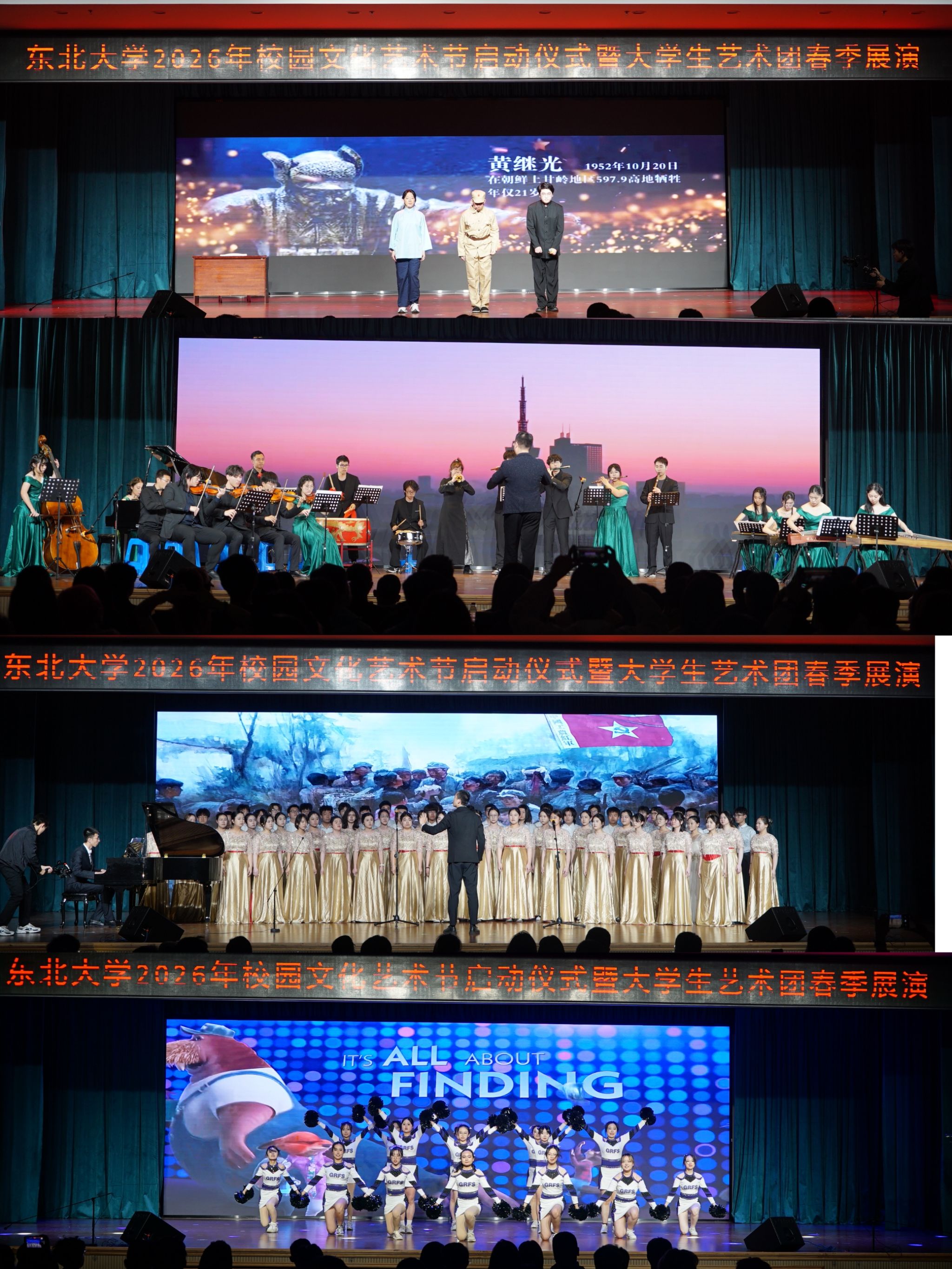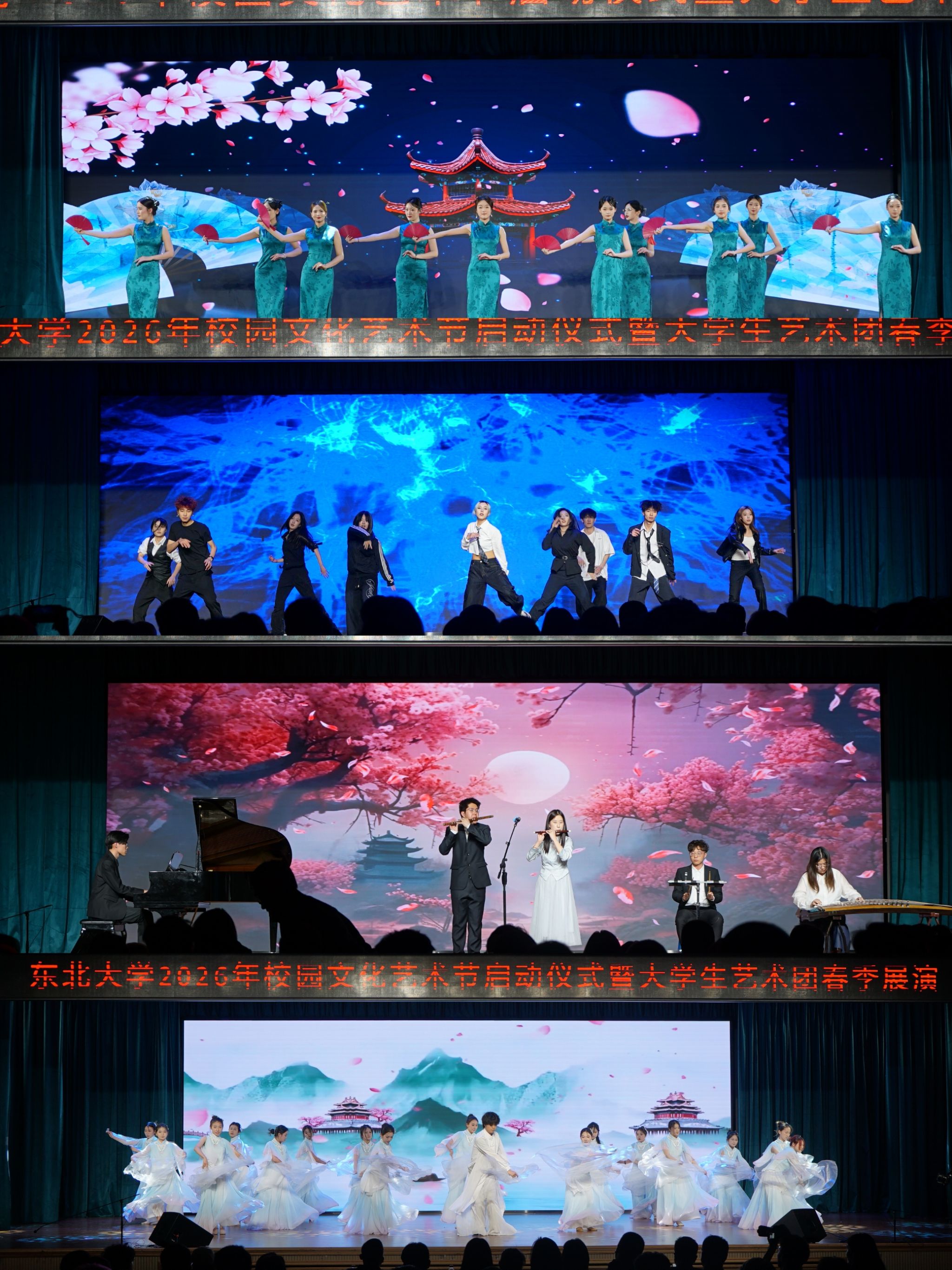 会上,校团委相关负责同志作校园文化艺术工作总结,介绍本年度校园文化艺术工作主要任务,并启动东北大学2026年校园文化艺术节。两校区九大艺术团轮番登台以“九团九色”为脉络,通过“溯·传承”“燃·驰风”“合·共生”三大篇章,实现传统文化与现代艺术的碰撞融合,让经典传承与时代创新交相辉映,带来沉浸式多元审美感受,通过合唱、舞蹈、朗诵、器乐、国风服饰走秀等多个精品节目,充分展现大学生艺术团的活力,尽显东大学子的青春姿态与时代风采。同期,大学生话剧团于两校区开展4场专场展演。