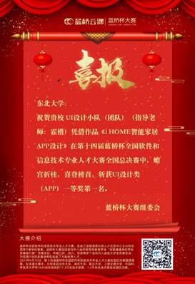 近日,第十四届蓝桥杯全国软件和信息技术专业人才大赛全国总决赛成绩揭晓。东北大学荣获全国一等奖6项、二等奖26项、三等奖35项,其中由艺术学院教师霍楷指导的周肖舒、赵玉洁、梁桂炜团队作品获得大赛UI设计类(APP)赛道全国一等奖第一名,获大赛组委会《喜报》祝贺。东北大学获评大赛视觉艺术设计赛道、软件类赛道优胜学校及视觉艺术设计赛道优秀组织单位,东北大学侯林、霍楷获评大赛“百佳指导教师”。
