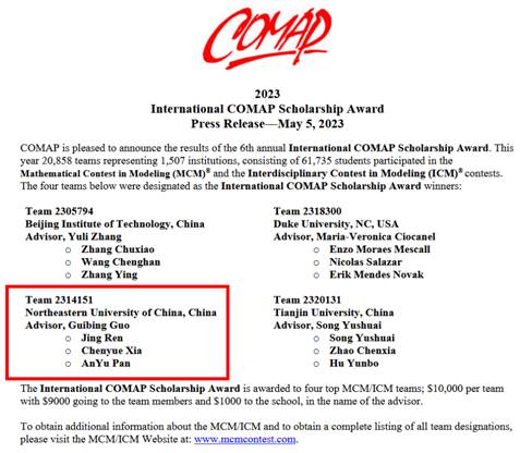 ASA奖是美国统计学会每年从大赛C题获得特等奖的队伍中挑选一支团队授予的特别荣誉,本届大赛全球参与C题的竞赛团队多达8011支,郭贵冰教授团队凭借优异成绩获得全球唯一的ASA奖,获奖率仅约为0.012%;COMAP奖学金是大赛组委会每年从全球所有参赛队伍中,挑选成绩最佳的四支团队予以表彰奖励。本届大赛,分别来自东北大学(中国)、北京理工大学(中国)、天津大学(中国)、杜克大学(美国)的四支团队,从全球20858支团队中脱颖而出,获得该项殊荣,获奖率仅约为0.019%,COMAP奖学金金额为10000美金,其中9000美金用于奖励参赛团队,1000美金用于奖励团队所属高校。
