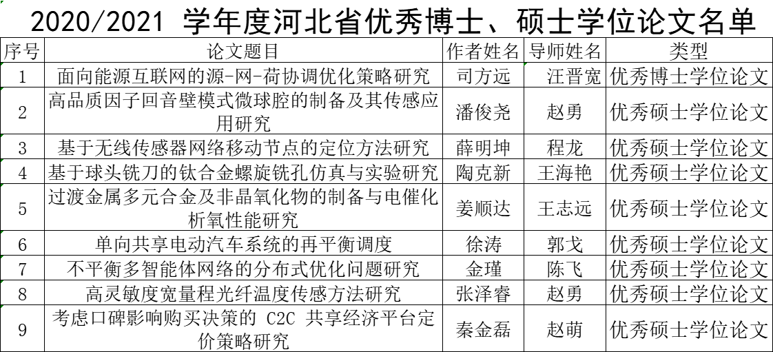 省级优秀博士、硕士学位论文评选是河北省为推进研究生创新教育改革、提高研究生培养质量、促进高层次创新型人才脱颖而出的重要举措。本次经单位推荐、专家评审和网上公示等程序,最终确定40篇博士学位论文和177篇硕士学位论文为2020/2021学年度河北省优秀博士、硕士学位论文。