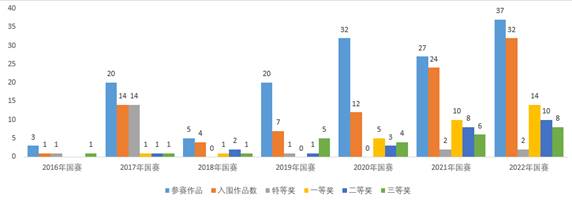 大赛自5月份启动以来,共有来自全国296所高校的2145项作品参赛,经过校赛、省赛选拔,1556项作品被推荐到国赛初赛。经专家盲评初审,500项作品入围决赛。按照疫情防控要求,决赛采取网络答辩形式。经过激烈角逐,最终评选出一等奖项目43项、二等奖 125项、三等奖346项。其中,学生组发明制作类(3组)、工艺改进类、创新设计类和生活创意类每组前2名共12项参赛作品进入总决赛答辩环节,角逐产生金奖1项、银奖2项、铜奖3项。