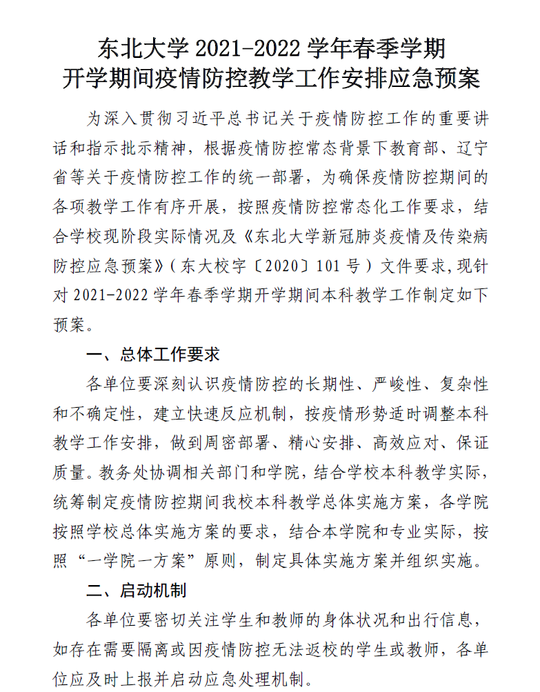 东北大学2021-2022学年春季学期开学期间疫情防控教学工作安排应急预案