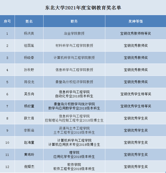 近日,2021年度宝钢教育奖评选结果公布。东北大学共有12名师生获奖。冶金学院杨洪英教授荣获“宝钢优秀教师特等奖”,这是我校教师连续4年获宝钢优秀教师特等奖、特等奖提名奖。材料科学与工程学院祖国胤、计算机科学与工程学院杨晓春、信息科学与工程学院孙秋野、秦皇岛分校经济学院陈俊龙4名教授获“宝钢优秀教师奖”。信息科学与工程学院本科生吴乐舟(总排名第二)、秦皇岛分校数学与统计学院本科生杨欣童荣获“宝钢优秀学生特等奖”,也是我校本科生连续第3年获此荣誉。信息科学与工程学院薛文倩、资源与土木工程学院李斯涵、计算机科学与工程学院赵海童、理学院黄玮玲、软件学院倪舜杰5名同学获“宝钢优秀学生奖”。
