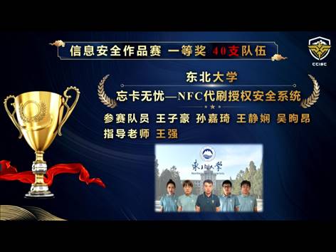 近日,第十四届全国大学生信息安全竞赛落幕。东北大学团队(作品)获得全国一等奖2项、三等奖3项、优胜奖4项,其中由软件学院王强老师指导的“忘卡无忧—NFC代刷授权安全系统”项目荣获大赛“作品赛”全国一等奖;软件学院王冬琦老师指导的N3X战队荣获大赛“创新实践能力赛”全国一等奖。王强、王冬琦老师分别获得大赛优秀指导教师;东北大学作为“作品赛”决赛分赛区承办单位荣获优秀组织奖。