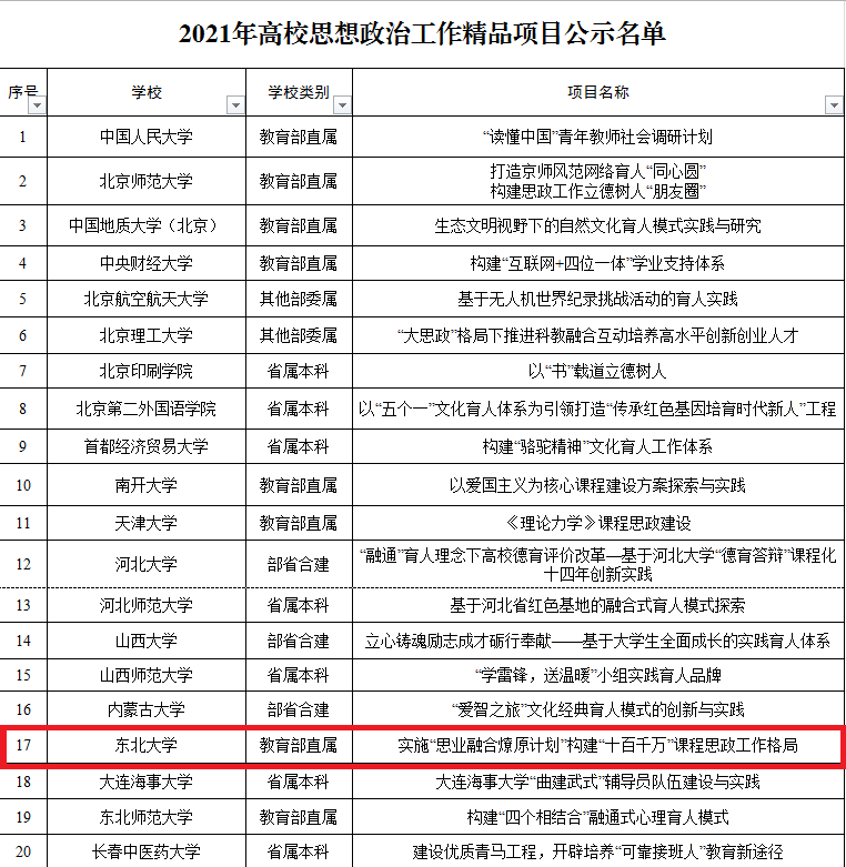 日前,教育部思想政治工作司公布了2021年度高校思想政治工作有关培育建设项目结果,东北大学申报的“实施‘思业融合燎原计划’ 构建‘十百千万’课程思政工作格局”入选高校思想政治工作精品项目。这是我校继“指南针驿站”“党家社校,全员铸魂,奏响组织育人‘三部曲’”2个项目之后,第3次获批教育部高校思政工作精品项目。