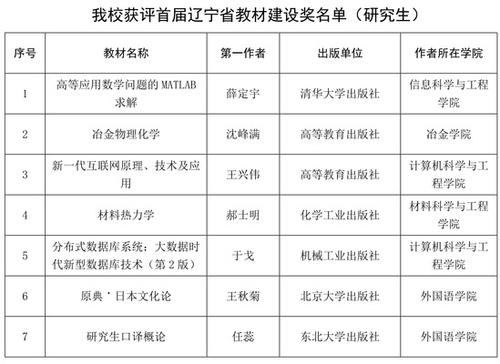 依据辽宁省教育厅发布的《关于公布首届辽宁省教材建设奖评选结果的通知》(辽教发〔2020〕46号),我校推荐的20部本科教材获评首届辽宁省教材建设奖,其中7部本科生教材被推荐申报首届国家教材建设奖;7部研究生教材获评首届辽宁省教材建设奖,其中1部研究生教材被推荐申报首届国家教材建设奖。