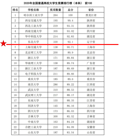 近日,中国高等教育学会高校竞赛评估与管理体系研究工作组发布2020全国普通高校大学生竞赛排行榜系列榜单。在《2020年全国普通高校大学生竞赛排行榜(本科)TOP100》中,东北大学奖项数量全国第三(330项),综合排名全国第六(总分92.1),刷新我校在该项权威榜单的排名记录。