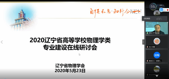 5月23日上午,由辽宁省物理学会、东北大学理学院主办的2020年辽宁省高校物理类专业建设在线研讨会举行。来自吉林大学、东北师范大学、哈尔滨工业大学、东北大学等全国高校的100余位教师参加研讨会。辽宁省物理学会副秘书长、东北大学理学院副院长王旗主持会议。
