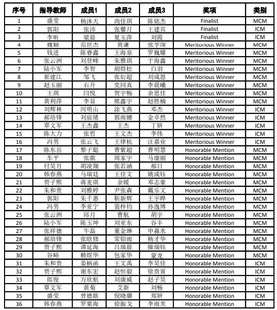 近日,2020年国际大学生数学建模竞赛(MCM/ICM)成绩揭晓。我校学生在本次竞赛中获得国际特等奖提名奖(Finalist)3项,国际一等奖(Meritorious Winner)13项,国际二等奖(Honorable Mention)20项,再创佳绩。