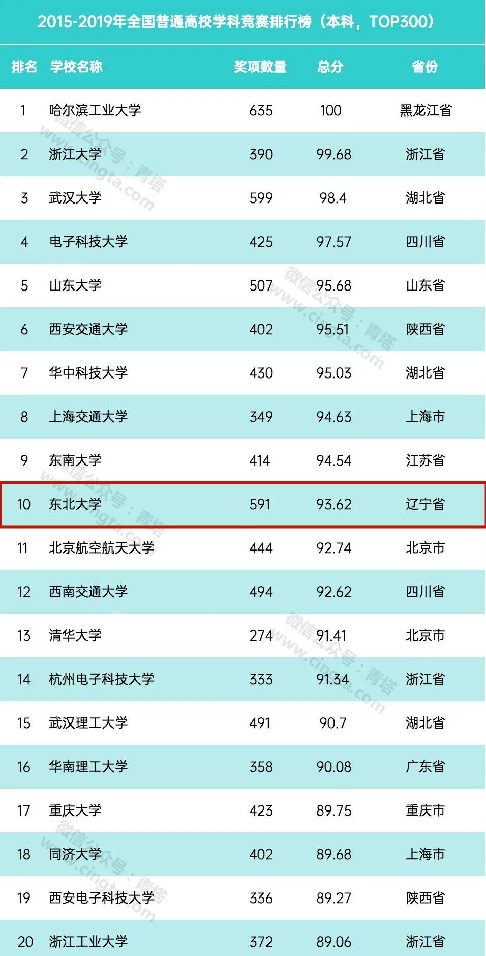 2月22日,中国高等教育学会《高校竞赛评估与管理体系研究》专家工作组发布2015-2019年和2019年全国普通高校学科竞赛排行结果。在2015-2019年全国普通高校学科竞赛排行榜(本科,TOP300)和2015-2019年全国“双一流”建设高校学科竞赛排行榜中,东北大学以591项获奖位列全国第三;以93.62的总分位居全国第十。位居前十位的其他高校分别为哈尔滨工业大学、浙江大学、武汉大学、电子科技大学、山东大学、西安交通大学、华中科技大学、上海交通大学、东南大学等一流大学建设高校。