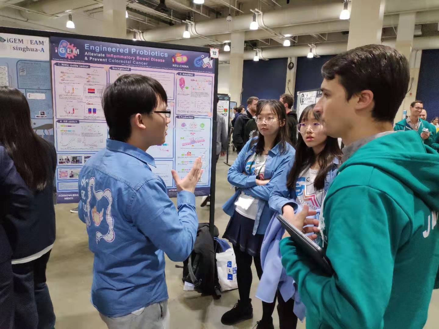 国际遗传工程机器设计竞赛(iGEM)由美国麻省理工学院(MIT)发起,要求参赛团队利用标准生物模块来构建基因回路、建立有效的数学模型,实现对精致复杂人工生物系统的预测、操纵和测量以完成比赛。自2018年11月起,NEU-CHINA团队便进入筹备阶段,以Engineered bacteria alleviate the inflammatory bowel disease and prevent colorectal cancer (工程化细菌缓解炎症性肠病并预防结直肠癌)为研究课题,使用工程化细菌释放白细胞介素10来缓解炎症性肠病,同时通过增强十字花科蔬菜中萝卜硫素的含量来预防结直肠癌,成功使用工程化细菌构建出更敏感的“NO Sensor”、更有效的治疗药物、更可行的“Amplifier”和更可靠的“Kill Switch”,为工程菌治疗重大疾病提出可行性方案。在课题研究过程中,学院多次开展评审会和预答辩,邀请费腾教授、盛韧教授和刘丽君教授等多名学者担任评委,全程以英文的方式进行交流指导,帮助其总结、提升。此外,积极参加国内外学术交流,确保研究前沿性、完善项目空白点,参加第六届中国地区iGEMer交流大会(CCiC)获得J23110 Award,参与全球重大挑战论坛,以本项目为基础混合国家编队在学生合作实验室中获得冠军,并向中、美、英三国政商届人士以及来自中国工程院、美国工程院和英国皇家工程院的院士做展示。