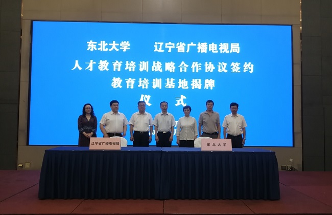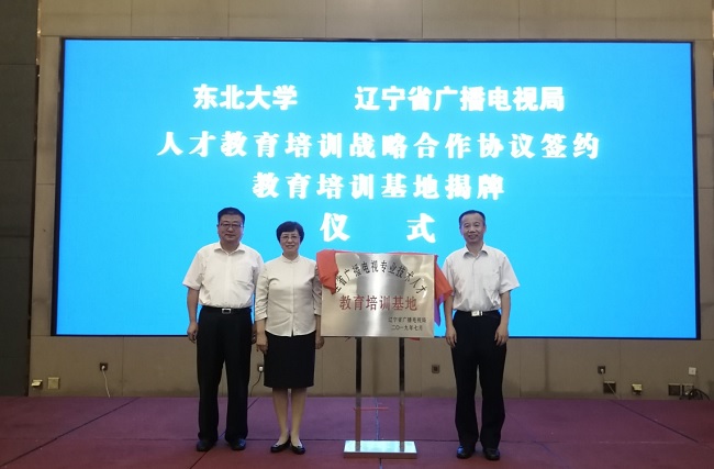 孙雷代表东北大学签署战略合作协议,杨晓东、熊晓梅、刘向阳共同为教育培训基地揭牌。根据协议,双方将共同打造广播电视专业技术人才队伍教育培训基地。省广电局为东北大学相关课程提供广播电视专业领域富有实践经验的讲座师资,为学生提供实训场所和实践机会。东北大学为省广电局送培人员提供教育培训服务,为省广电局研发和转化科技成果提供相关支持。当天下午,双方合作的第一项成果——全省广播电视局(台)长培训班正式开班。