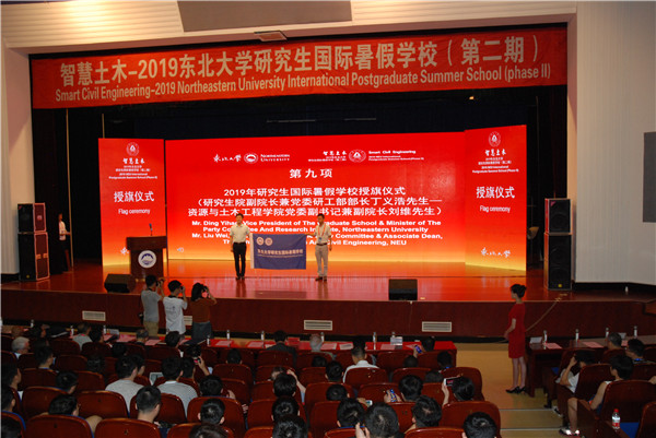 研究生院副院长、党委研究生工作部部长丁义浩向资源与土木工程学院党委副书记、副院长刘维授旗,标志着暑期学校正式开始。开幕式发布了东北大学土木工程形象宣传片,展现了东北大学土木工程学科的发展方向和学科布局,展示了专业教师对土木工程面向未来的思考,回答了新时代土木学科的变革之问。