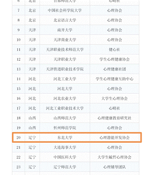 近日,由共青团中央维护青少年权益部、中华全国学联秘书处指导,中国青年报社主办的高校学生心理健康社团寻访活动评审结果公布。经专家评审,东北大学心理潜能开发协会入选高校学生心理健康社团择优遴选名单。