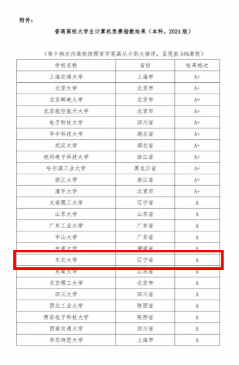 近日,在福建福州举行的第61届中国高等教育博览会·高校教师教学发展与创新人才培养学术活动中,全国高等学校计算机教育研究会等部门联合发布我国首个“普通高校大学生计算机竞赛指数(本科,2024版)”,东北大学以TOP1-3%(含)分数段获“A”档评级。这也是东北大学继《2023年全国普通高校大学生竞赛榜单》(排名全国第五)和第五轮“全国普通高校大学生机器人竞赛指数”(获评A+)后,再一次在全国权威竞赛榜单(指数)中取得优异成绩。