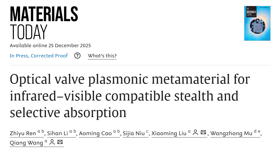 近日,东北大学王强、刘晓明团队在外场辅助制备金属基电磁吸收材料领域取得重要进展,相关成果以“Optical valve plasmonic metamaterial for infrared-visible compatible stealth and selective absorption”为题发表在国际权威学术期刊Materials Today。东北大学为该论文的第一完成单位,冶金学院博士研究生任志宇为第一作者,刘晓明研究员与王强教授为共同通讯作者。