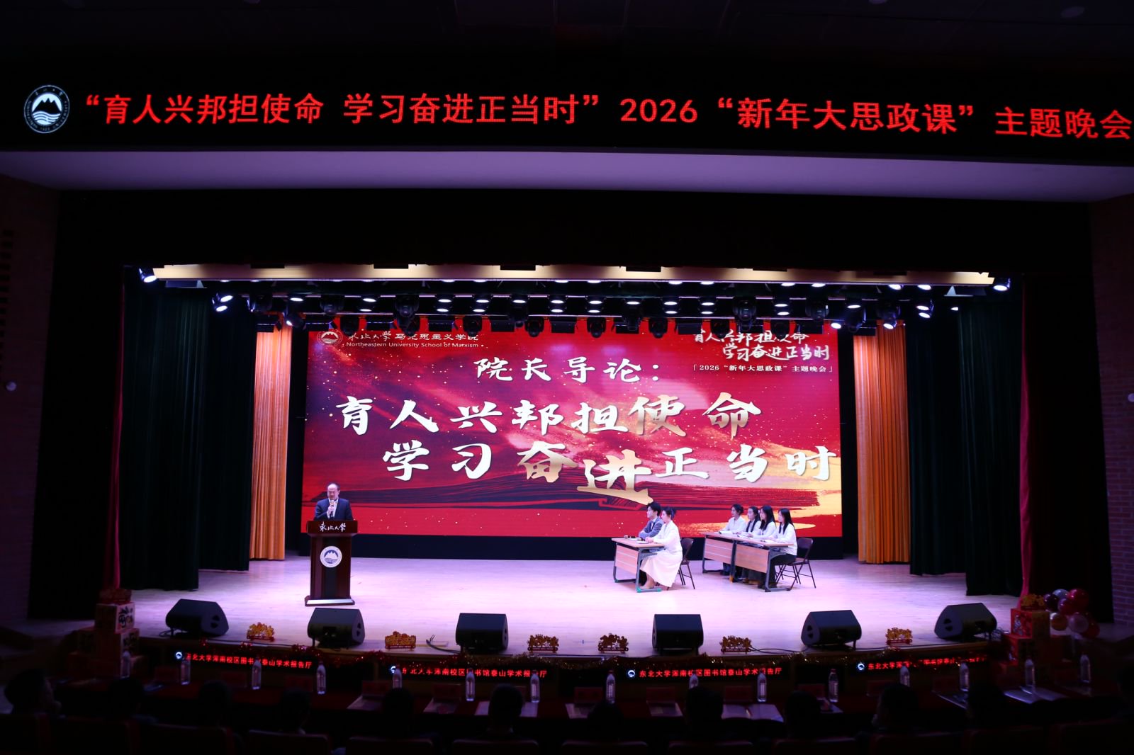 12月30日晚,东北大学马克思主义学院“育人兴邦担使命 学习奋进正当时”2026“新年大思政课”主题晚会在浑南校区图书馆泰山学术报告厅举行。东北大学党委书记郭海出席活动并为获得躬耕科研标兵的获奖教师颁奖。大东区委宣传部、浑南区委宣传部相关领导,学校相关部门负责人,学院领导班子成员,全体师生参加活动。