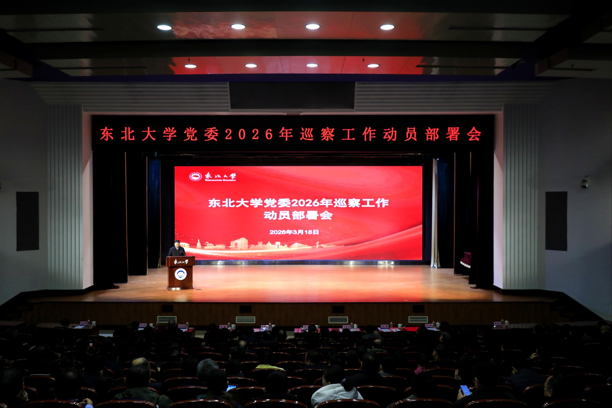 3月18日,东北大学党委2026年巡察工作动员部署会在汉卿会堂蔡冠深报告厅举行。校党委书记、党委巡察工作领导小组组长郭海出席会议并讲话,校长、党委巡察工作领导小组组长冯夏庭主持会议。学校领导班子成员、党委巡察工作领导小组成员、党的建设和全面从严治党工作领导小组成员、党委2026年第一轮巡察组成员、分党委书记、二级纪委书记、副处级以上干部参加会议。