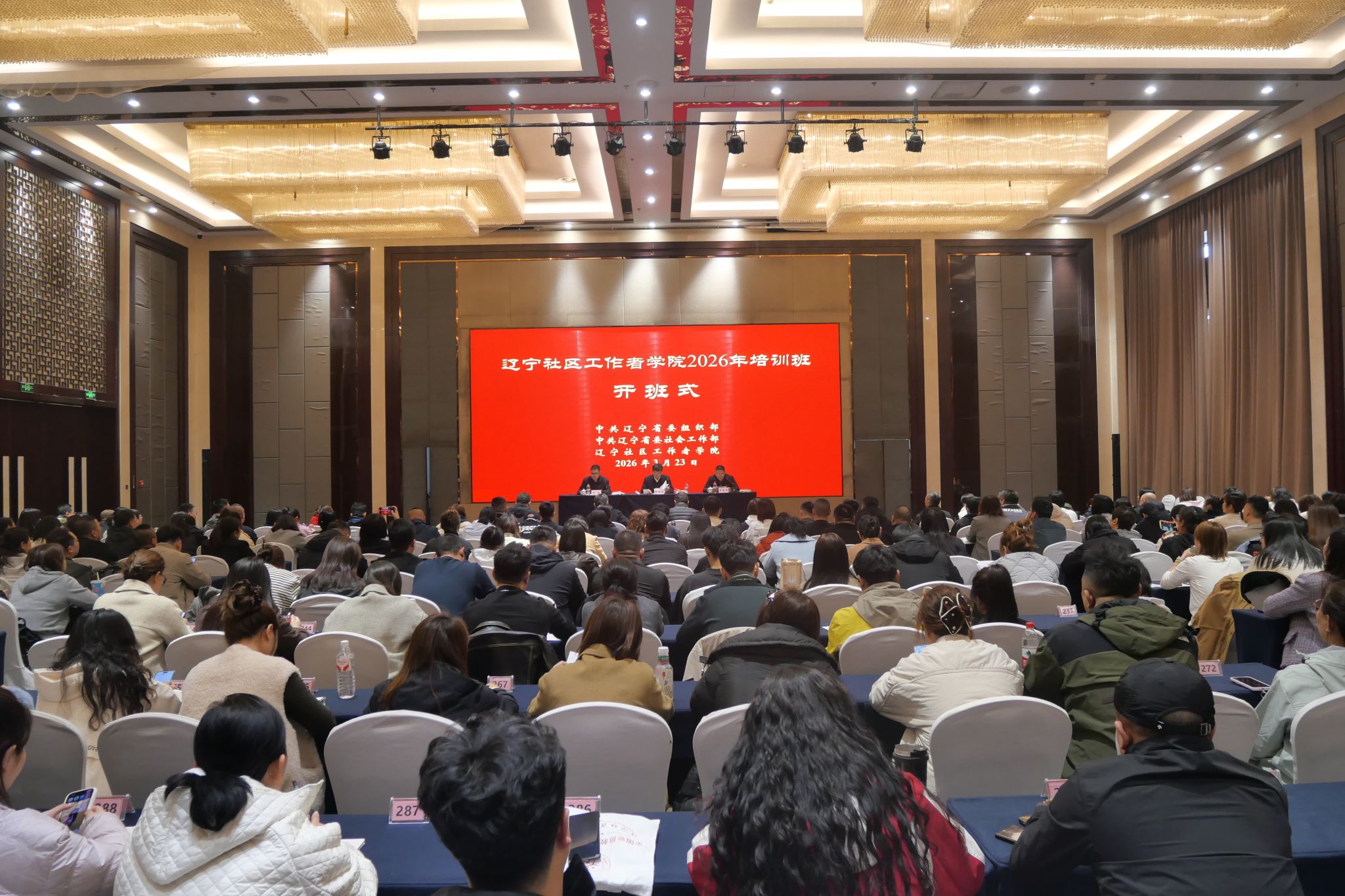 3月23日,辽宁社区工作者学院2026年首期培训班在东北大学国际学术交流中心开班。省委社会工作部副部长蔡鸿源,东北大学党委副书记、纪委书记吴豪伟,省委组织部组织三处处长付新,以及省委组织部、省委社会工作部、东北大学相关负责同志出席开班式。开班式由付新主持。