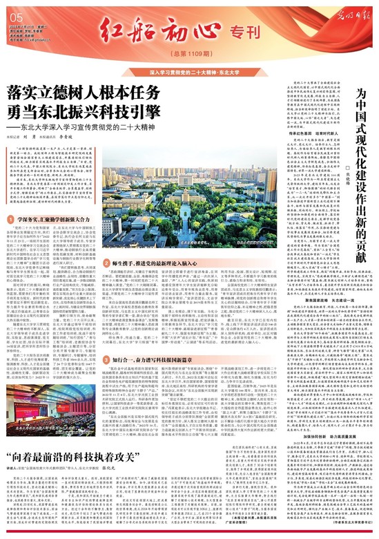党的二十大擘画了全面建设社会主义现代化国家、以中国式现代化全面推进中华民族伟大复兴的宏伟蓝图,对坚持教育优先发展、科技自立自强、人才引领驱动进行了系统部署,为我国高等教育在中国式现代化进程中实现新跨越、担当新使命指明了前进方向。东北大学以党的二十大精神为指引,扎根中国大地、心怀“国之大者”、矢志建设一流,为中国式现代化建设不断作出新的贡献。