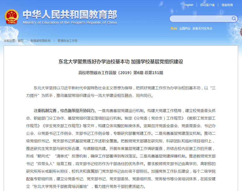 在“全国党建工作示范高校”培育创建工作中,东北大学党委坚持以习近平新时代中国特色社会主义思想为指导,把抓好学校党建工作作为办学治校的基本功,以实施“基层党建质量夯实工程”为载体,努力构筑“机制完善、特色发展、创新驱动、辐射示范”的四维基层党建工作体系,不断推动学校基层党建工作质量提升,为学校各项事业发展提供坚强保证,汇聚起建设“中国特色、世界一流”大学的东大力量!