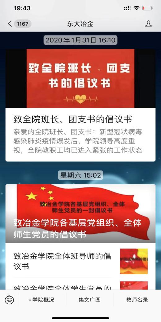 学院依托“东大冶金”“东大冶金党微”公众号、学院网站、微博、抖音、QQ空间等渠道,发布了《新型冠状病毒感染的肺炎疫情防控指南》《疫情防控热点新闻》《病毒来袭不要怕,可防可控有妙招》等信息,传达疫情防控政策要求,介绍学校学院最新工作进展,普及疫情防控知识,宣传疫情防控中的先进典型事迹,引导全体师生不信谣、不传谣,多角度、全方位弘扬正能量。面向不同群体的一份份有内容、有温度的倡议书和公开信,发挥了鼓舞士气、凝聚人心的作用,营造出众志成城、共克时艰的良好氛围。身处全国各地的冶金学子,通过小视频、vlog等方式积极发声,为武汉加油,为祖国加油!