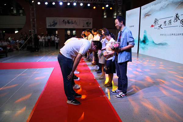 第二篇章“铭师恩”,教师代表马克思主义学院副教授任鹏寄语毕业生。毕业生向毕业班班导师、“最想见到的专业教师”、毕业生辅导员、宿舍管理员代表献上鲜花并行谢师礼。学校第二十一届研究生支教团代表出演音乐情景剧《长大后我就成了你》。