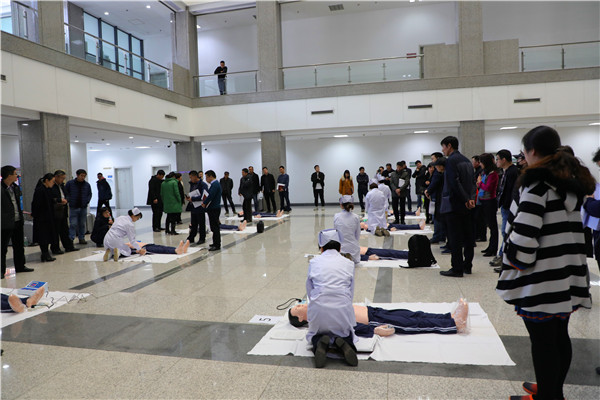 会议期间,校医院院长孙鸿光作了心肺复苏技能培训,校医院医护人员指导与会人员进行了心肺复苏的实际操作演练。