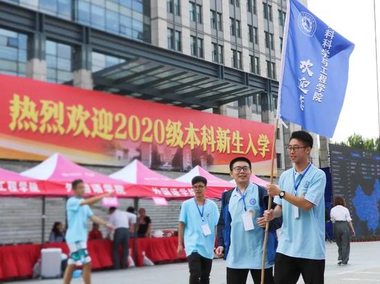 广场上,“热烈欢迎2020级新生入学”的巨型喷绘格外醒目,迎新现场四处洋溢着欢乐的氛围。各学院的迎新报到场地沿着主楼北侧一字排开,迎新工作人员和志愿者微笑着迎接来自五湖四海的新同学。一张张热情的笑脸,一声声耐心的引导,让新生们真切地感受到家的温暖。