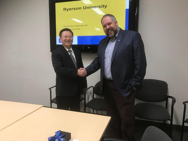 代表团访问加拿大瑞尔森大学期间,会见瑞尔森大学国际事务办公室项目负责人David J.Begg先生。双方介绍了各自学校的办学特色,在学生短期交流培养、东北大学海外经济管理学者讲习营、东北大学奖学金项目,以及师资交流等方面进行了深入探讨和交流,共同认为具有广泛的合作空间,愿意进一步加强联络沟通,推动具体合作事项落地。David J.Begg先生表示,瑞尔森大学新闻学、市内设计学在加拿大是名列前茅的,在商学、经济学等专业具有优势,希望东北大学的学生能够到瑞尔森大学进行1个学期或1学年的交流学习。代表团访问了瑞尔森大学机械与工业工程系,与系主任Donatus Oguamanam教授就教师交流等事宜进行了商讨。