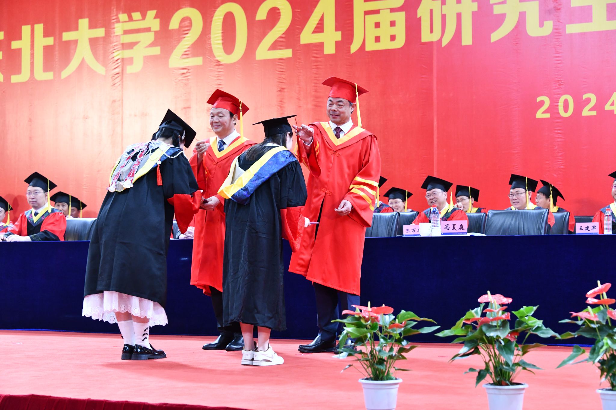 王强宣读东北大学关于授予2024届研究生博士、硕士学位的决定。根据《中华人民共和国学位条例》《东北大学章程》《东北大学授予研究生学位的工作细则》的有关规定,决定授予侯甜甜等594人博士学位,韩青竹等4966人硕士学位。