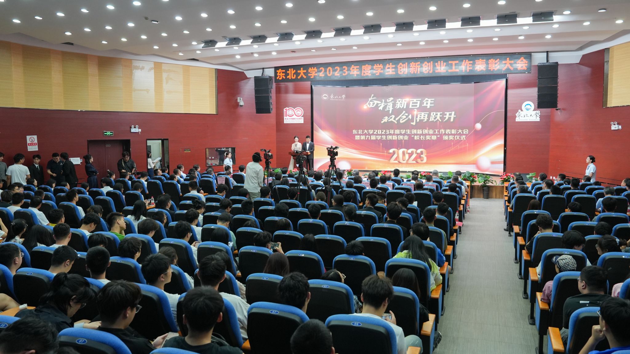 6月21日晚,“奋楫新百年 双创再跃升”东北大学2023年度学生创新创业工作表彰大会暨第九届学生创新创业校长奖章颁奖仪式在南湖校区科学馆201建龙学术报告厅举行。建龙(辽宁)节能环保研究院常务副院长兼抚顺新钢铁有限责任公司技术中心常务副主任王金华、东北大学深圳校友会会长陈伯君、青岛中鸿重型机械有限公司董事长宁晓峰、东北大学汉卿高尔夫球会副会长何雄、沈阳东大迈骏教育科技有限公司总经理刘珺、北京中睿高科信息技术有限公司董事长金摇光、万学教育科技集团北方大区总裁牛晋、校长冯夏庭、副校长王强出席颁奖典礼,学校相关负责人,获奖师生代表等共计300余人参加活动。本次颁奖典礼在东北大学官方抖音平台同步直播,累计1.5万人在线观看。