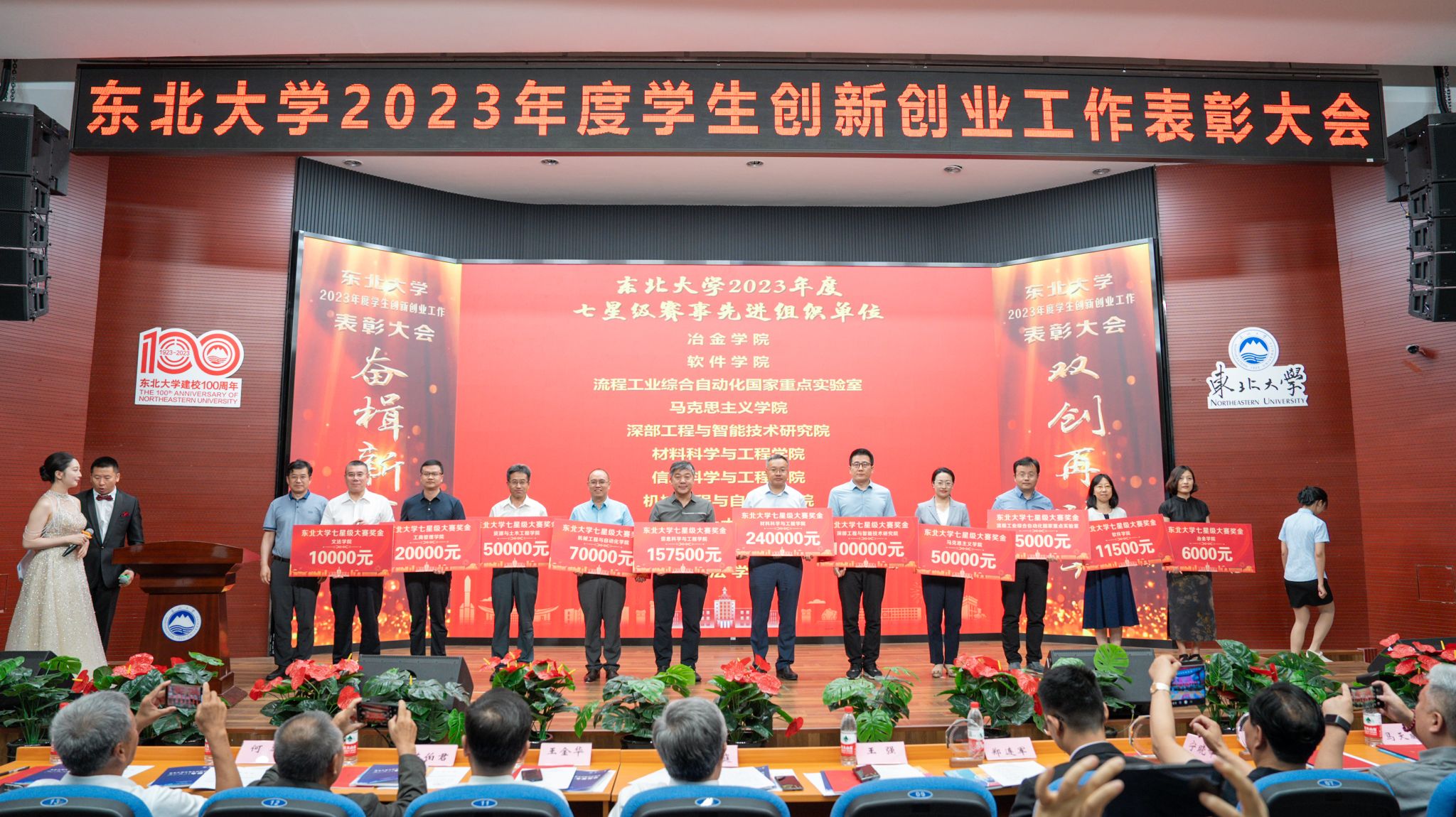 表彰大会上,全体师生共同回顾和总结了过去一年学校学生创新创业工作所取得的优异成绩,与会嘉宾为获奖师生代表颁奖。杨威等325名教师获评东北大学2023年度学生创新创业活动优秀指导教师;蔡晓淇等55名教师获评东北大学2023年度学生创新创业工作先进个人;叶琳等57名学生获评东北大学2023年度校园科技创新活动优秀学生干部;陈洪姚等66名学生获评东北大学2023年度“大学生创新创业训练计划”优秀学生;创意设计创新团队、未来结构师创新团队、仿生智能创新团队、IEST创新团队、ACM创新团队获评东北大学2023年度优秀学生创新团队;材料科学与工程学院学生创新创业基地、信息科学与工程学院学生创新基地、计算机科学与工程学院学生创新创业基地、软件学院学生创新创业基地、大学生工程训练创新基地获评东北大学2023年度优秀学生创新创业基地,吕晓、毕鑫、陈猛、顾晓薇、任玉平、林明秀、刘金海、刘小锋、郭贵冰、闻时光获评东北大学2023年度创新创业十佳指导教师标兵;陈红兵、张燕楠、徐大可、孔祥伟、吴刚获评东北大学2023年度创新创业教育教学名师;北京建龙重工集团有限公司、华为技术有限公司、东北大学汉卿高尔夫球会、东北大学深圳校友会、青岛中鸿重型机械有限公司、沈阳东大迈骏教育科技有限公司、沈阳森之高科科技有限公司7家单位及金摇光、张强2人获评东北大学2023年度创新创业教育突出贡献奖;文法学院、马克思主义学院、工商管理学院、资源与土木工程学院、冶金学院、材料科学与工程学院、机械工程与自动化学院、信息科学与工程学院、软件学院、流程工业综合自动化国家重点实验室、深部工程与智能技术研究院等11家单位获评东北大学2023年度七星赛事先进组织单位,学校给予建设奖励经费,王强为获奖学院相关负责人颁发奖励。