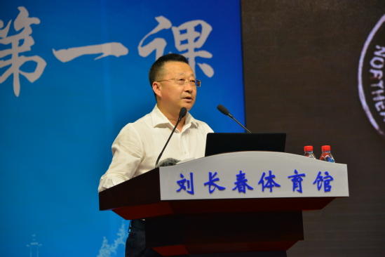9月10日下午,校党委副书记张国臣在刘长春体育馆为全体2019级本科生讲授“新生第一课”——“家国担当:与国家发展和民族复兴同向同行的东北大学”。学生工作处、国防教育学院相关负责人,部分学生工作干部、辅导员、全体军训教官参加此次“新生第一课”活动。