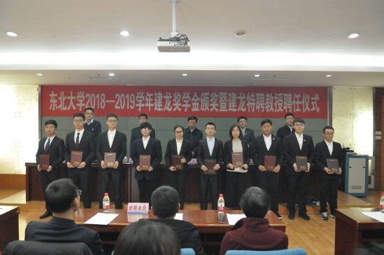 11月27日下午,东北大学2018—2019学年建龙奖学金颁奖暨建龙特聘教授聘任仪式在汉卿会堂402室举行。抚顺新钢铁有限责任公司党委书记宋亚庆、人事行政处行政管理室主任刘志伟,东北大学副校长孙雷,对外联络与合作处、学生工作处相关负责人,建龙特聘教授获聘教授、建龙奖学金获奖学生出席仪式。