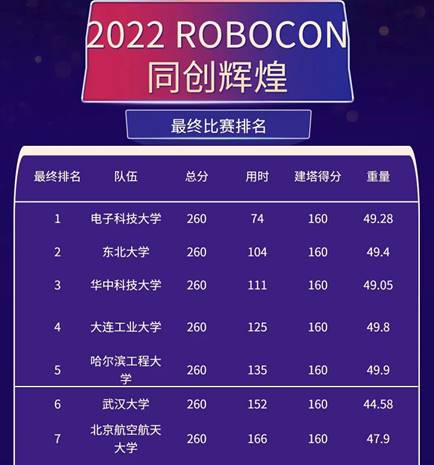 本届全国大学生机器人大赛ROBOCON赛事的主题为“同创辉煌”,由全国大学生机器人大赛组委会主办。根据本届大赛的规则,参赛队的两台机器人相互配合,先将场上的两座积木塔分别打散,再按积木的大小顺序和新的样式搭建两座新塔。比赛以3分钟为期进行倒计时,最后根据任务完成情况赋分,按得分高低进行排名,得分相同则用时短者排名在前。本届大赛共持续2个比赛日,每个团队在每个比赛日有一次竞赛机会,最终取2个比赛日竞赛的最好成绩计算最终排名。