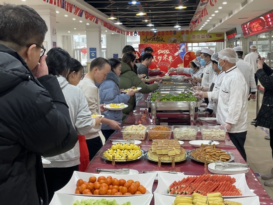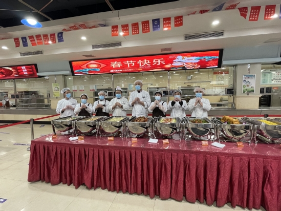 学生城食堂里张灯结彩,洋溢着浓浓的年味。学校后勤服务中心为研究生们准备了丰盛的年夜饭和节日大礼包。