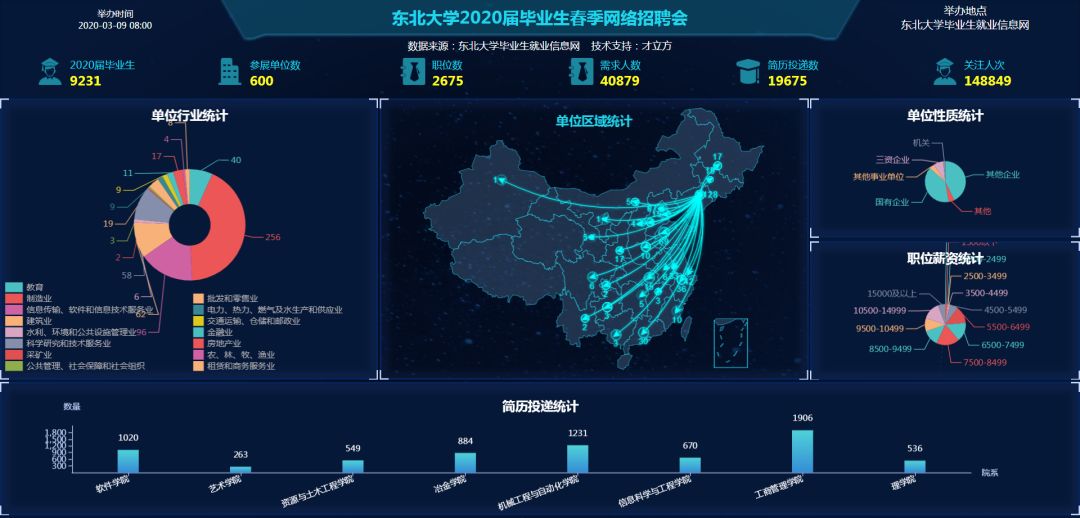 此次双选会,用人单位从参会报名、信息确认、发布招聘岗位到筛选学生简历,毕业生从查询岗位、投递简历到在线面试都实现了全程网络化。同时,依托就业信息网大数据平台,对毕业生求职应聘数据进行了实时呈现,展现了信息化系统在数据分析上的强大优势,为学校把握学生就业动态和对未就业学生精准帮扶提供了科学的参考依据。毕业生们迅速适应网络招聘节奏,提前浏览企业信息,悉心准备电子简历,统筹安排在线面试,简历投递总数达2.4万份,视频面试大厅累计完成在线面试4300余次。