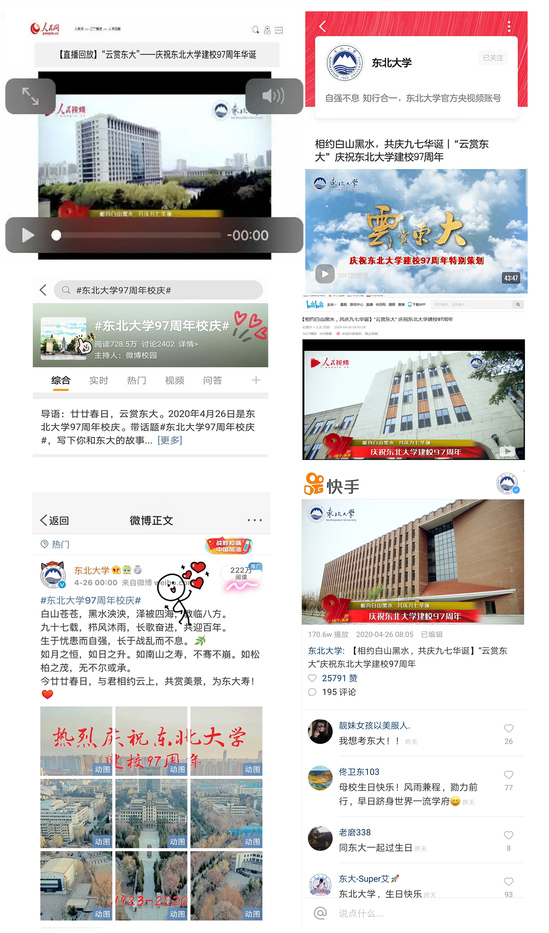 正是东大好风景,相约云端再逢君。每年的今天,都有很多校友、师生齐聚东大校园,赏南湖春景,忆浑南时光,叙东大情缘。在“云赏东大”活动里,学校通过人民网、央视频、东北大学官方微博、快手、bilibili(哔哩哔哩)等网络平台,带领大家云游东大,一起寻找最美的时光。截至发稿前,各网络平台视频播放量累计近200万次。