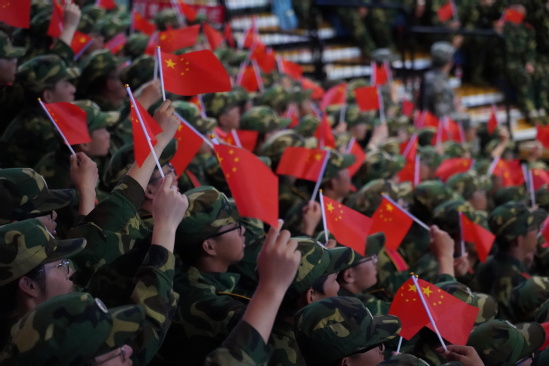 东大学子5千人快闪《我和我的祖国》将宣讲会推向高潮。伴随着音乐响起,全场传递国旗。随着巨幅国旗的缓缓移动,国旗下的青年学子伸出双手触摸五星红旗,所有人都沉浸在浓浓的爱国氛围之中……