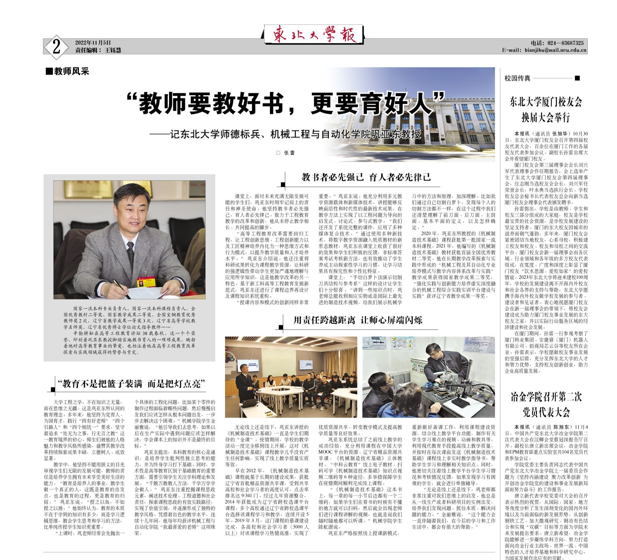 课堂上,面对未来充满无限发展可能的学生们,巩亚东时刻牢记肩上的责任和神圣使命。他坚持教书者必先强己,育人者必先律己。致力于工程教育教学的改革和创新,他从未停止教学相长、共同提高的脚步。