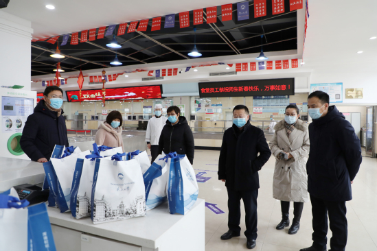 每到一处,熊晓梅都热情地与大家握手交谈,对同志们春节期间放弃与家人团聚,始终坚守岗位、无私奉献表示衷心感谢,希望通过他们向其家人转达节日的祝福,并为大家送上慰问品。熊晓梅详细询问了留校过年学生的饮食安排、寒假和春节期间各项工作运行情况,仔细了解值班人员的工作和生活情况,希望相关单位和工作人员毫不松懈地做好校园疫情防控工作,以高度的责任感和使命感,切实做好各项保障服务工作,确保师生度过一个安定祥和的春节。